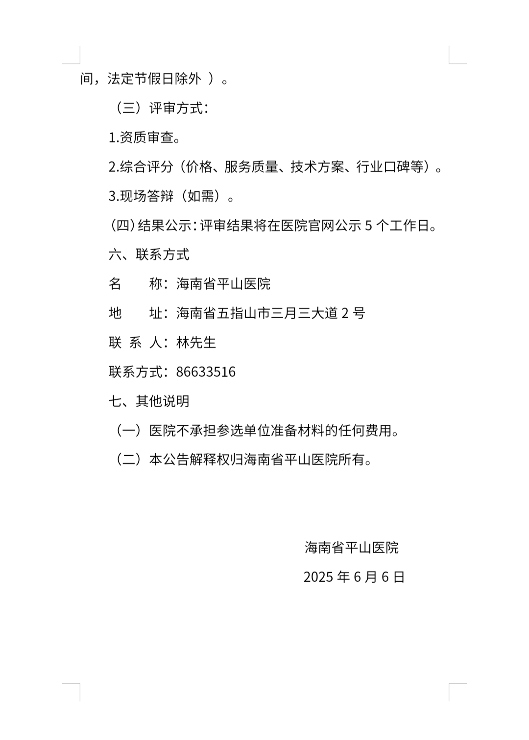 海南省平山医院引进医学检验服务合作单位公开遴选公告