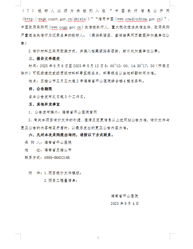 海南省平山医院官方网站迁移升级项目院内公开询价公告