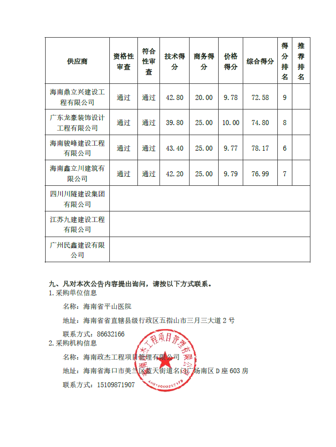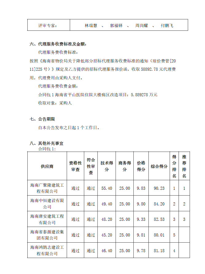 海南省平山医院住院大楼病区改造项目建设工程监理—成交结果公告