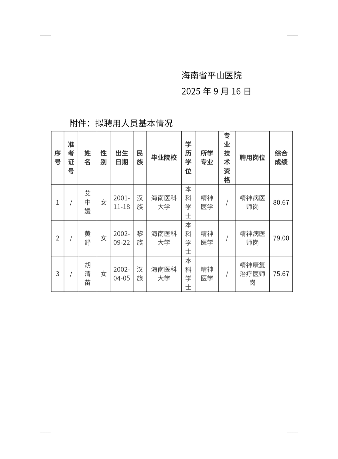 关于海南省平山医院2024年“汇聚海南·四城同办”考核招聘事业编制工作人员(第二批)拟聘用人员公示