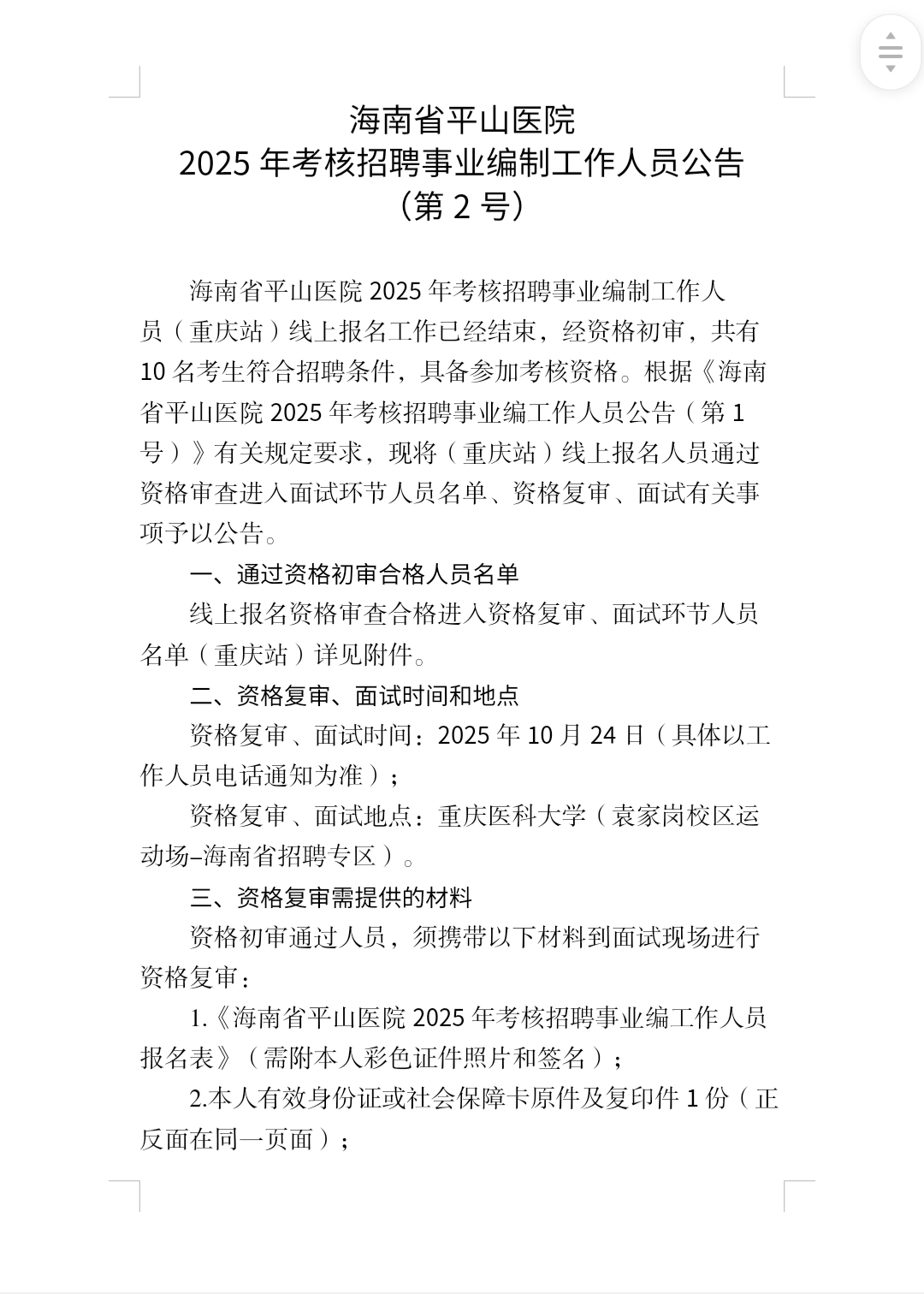 海南省平山医院 2025年考核招聘事业编制工作人员公告 (第2号) 海南省平山医院2025年考核招聘事业编制工作人员(重庆站)线上报名工作已经结束,经资格初审,...