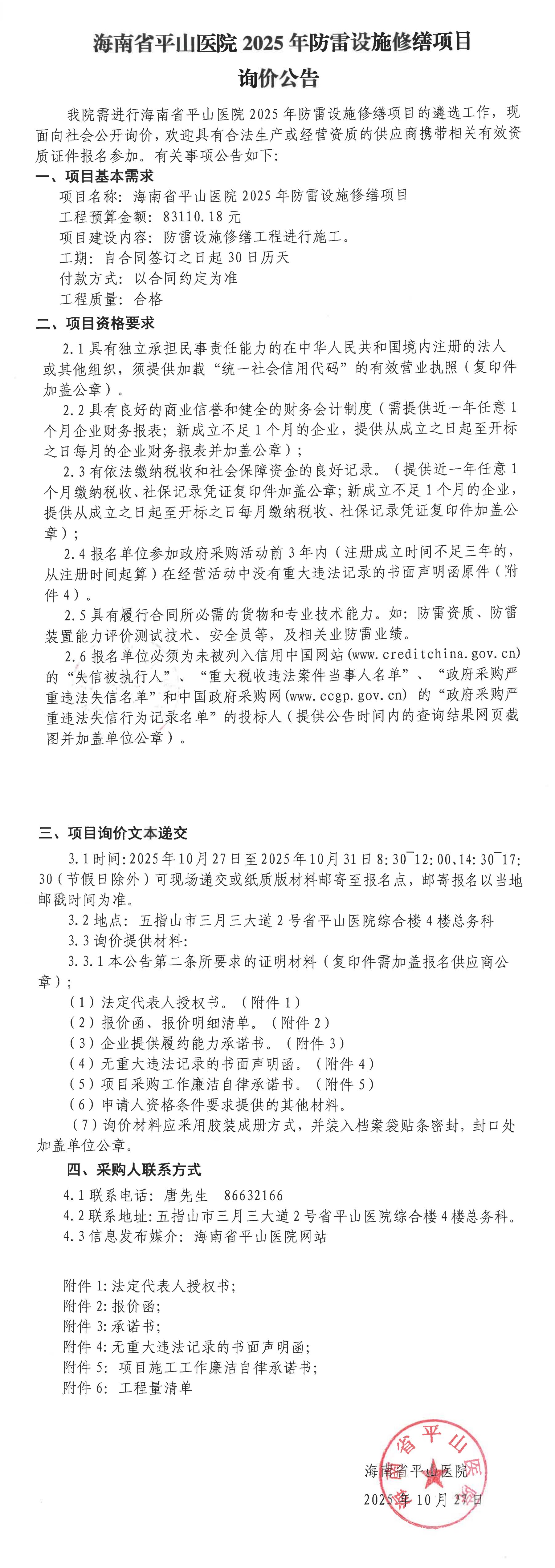 海南省平山医院2025年防雷设施修缮项目询价公告