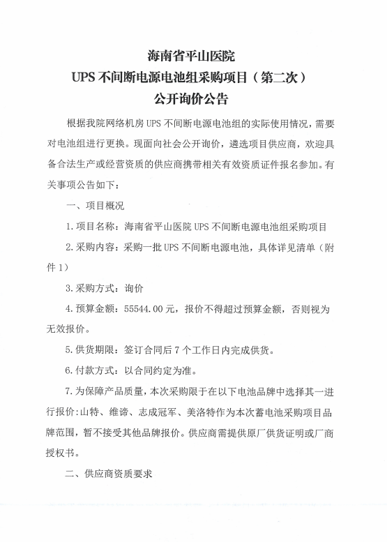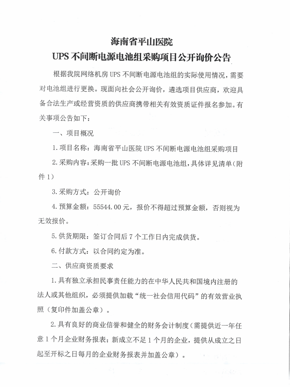 海南省平山医院UPS不间断电源电池组采购项目(第二次)公开询价公告