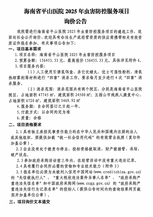 海南省平山医院2025年虫害防控服务项目询价公告