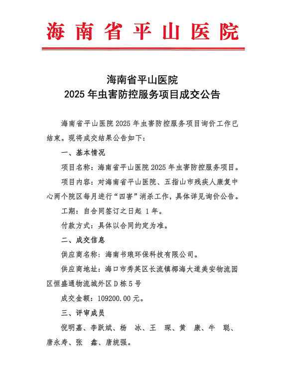 海南省平山医院2025年虫害防控服务项目成交公告