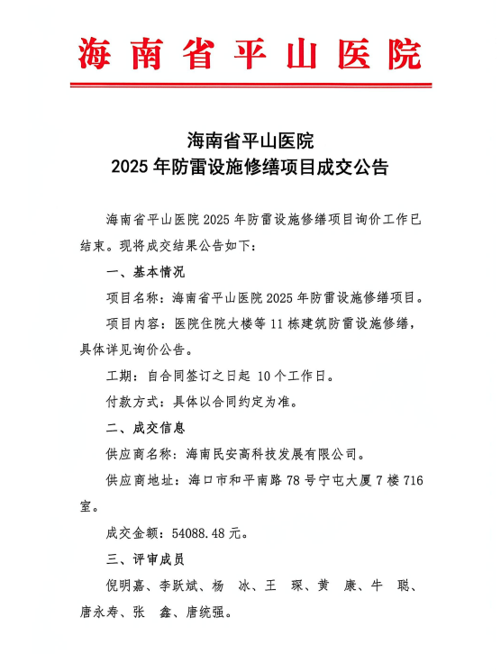 海南省平山医院2025年防雷设施修缮项目成交公告