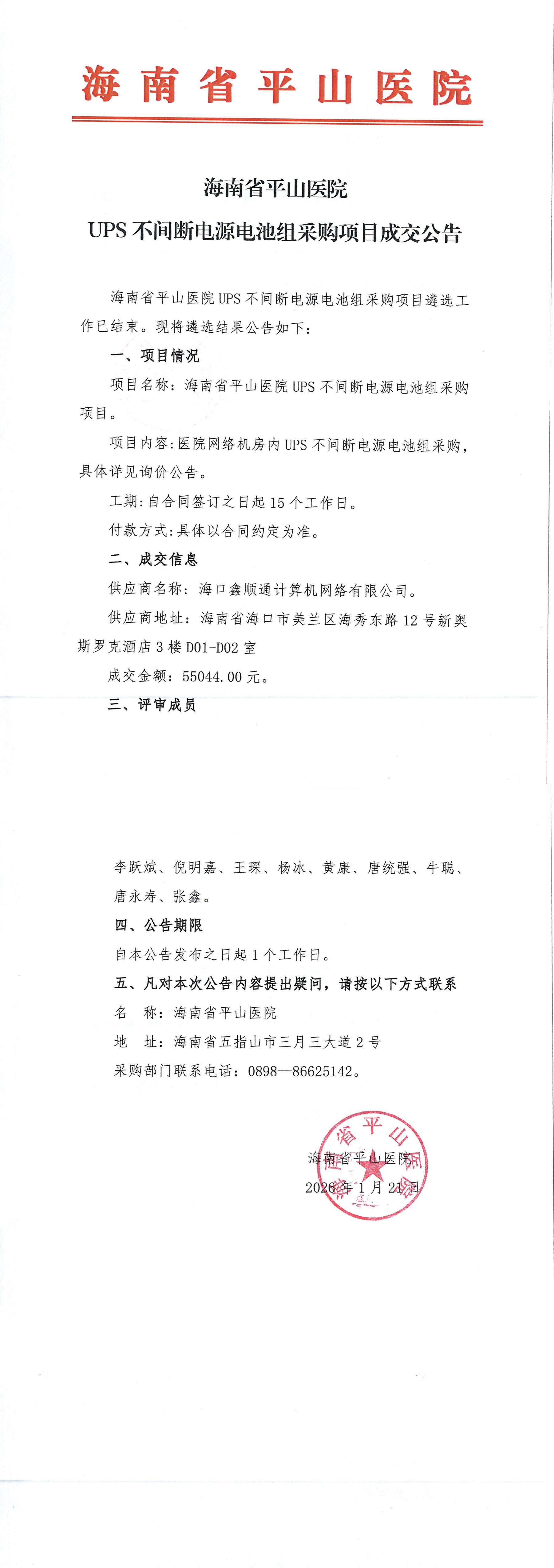 海南省平山医院 UPS不间断电源电池组采购项目成交公告