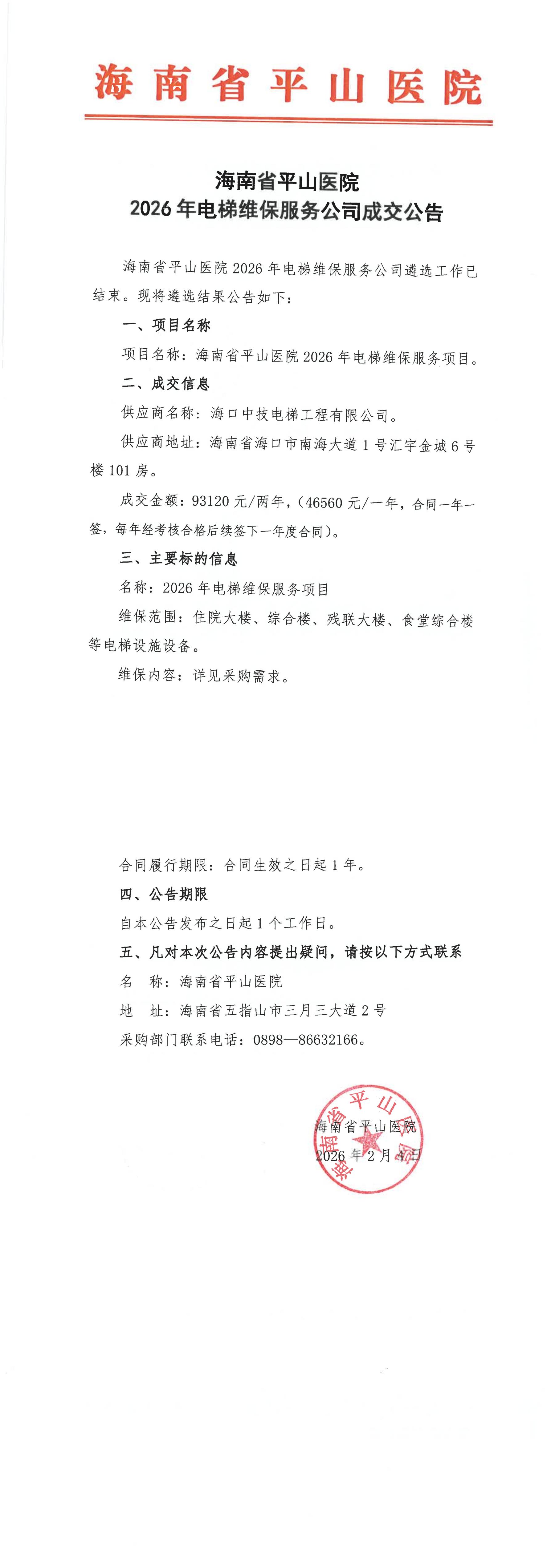 海南省平山医院2026年电梯维保服务公司成交公告