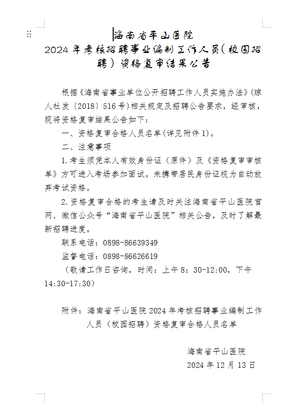 海南省平山医院2024年考核招聘事业编制工作人员(校园招聘)资格审核结果公告