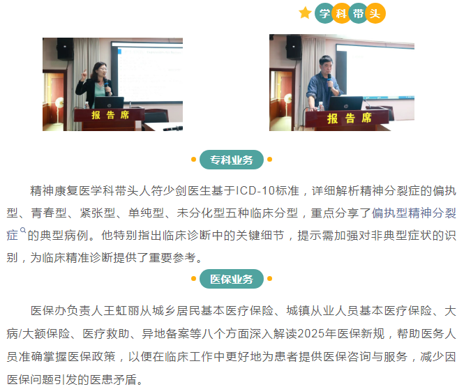 12月9日下午,海南省平山医院在综合楼六楼会议室召开全院医务人员常态化业务学习会。本次会议聚焦临床专业能力提升与国际化服务准备,邀请心理科负责人苏朝霞教授、精神科符少剑医生、医保办负责人王虹丽分别围绕《医院常用英语》《精神分裂症分型与病例分享》《关于基本医疗保险的管理规定》三大主题授课,为全院医务人员带来一场多维度、深层次的专业盛宴。
