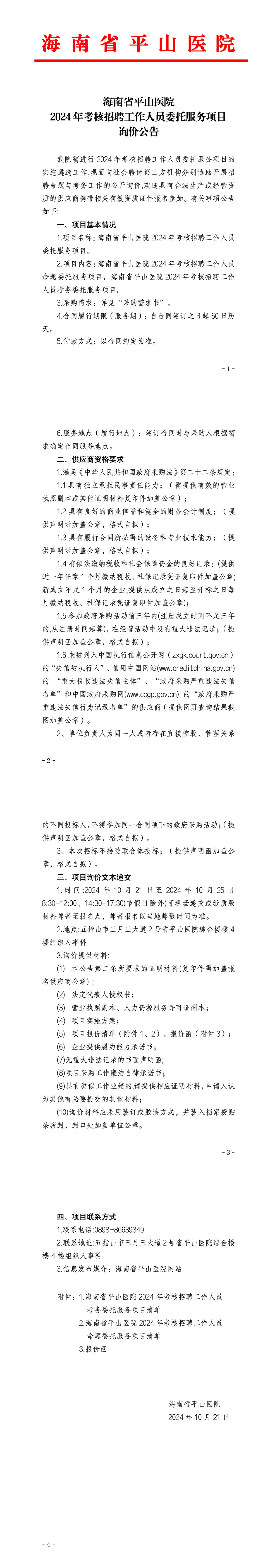 海南省平山医院 2024年考核招聘工作人员委托服务项目 询价公告