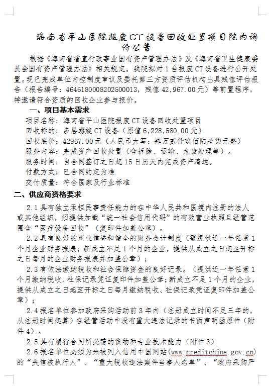 海南省平山医院报废CT设备回收处置项目院内询价公告