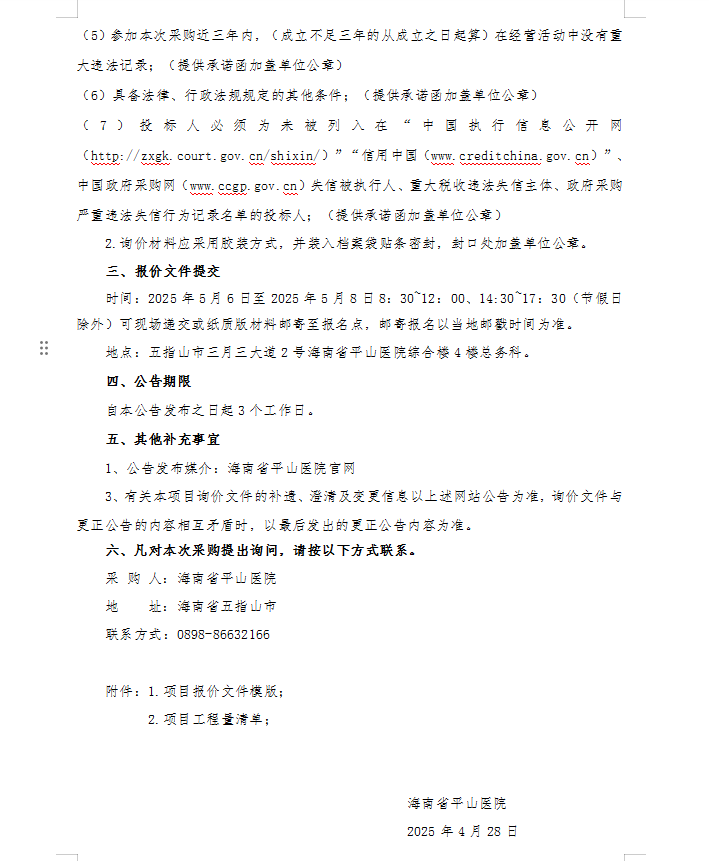 海南省平山医院关怀病区热水系统建设项目院内公开询价公告