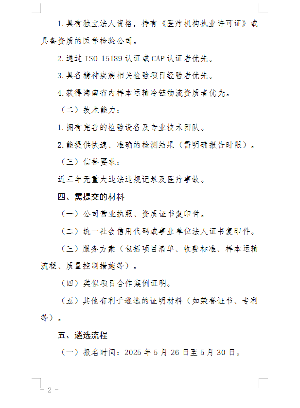 海南省平山医院引进医学检验服务合作单位公开遴选公告
