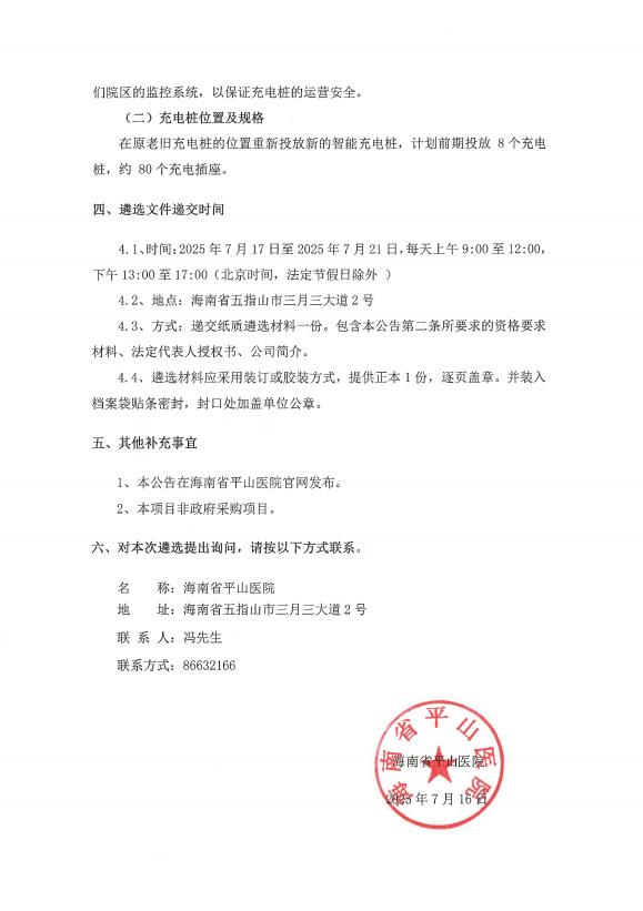 海南省平山医院新智能电动摩托车充电桩建设引进合作供应商遴选公告