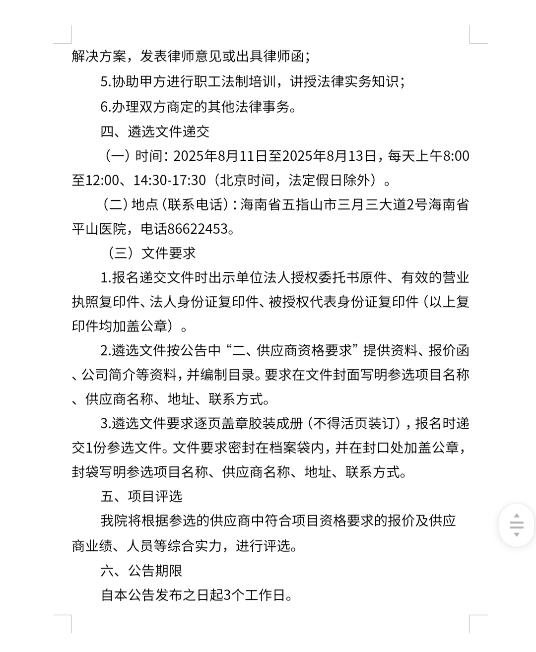 海南省平山医院关于公开遴选法律顾问服务的公告