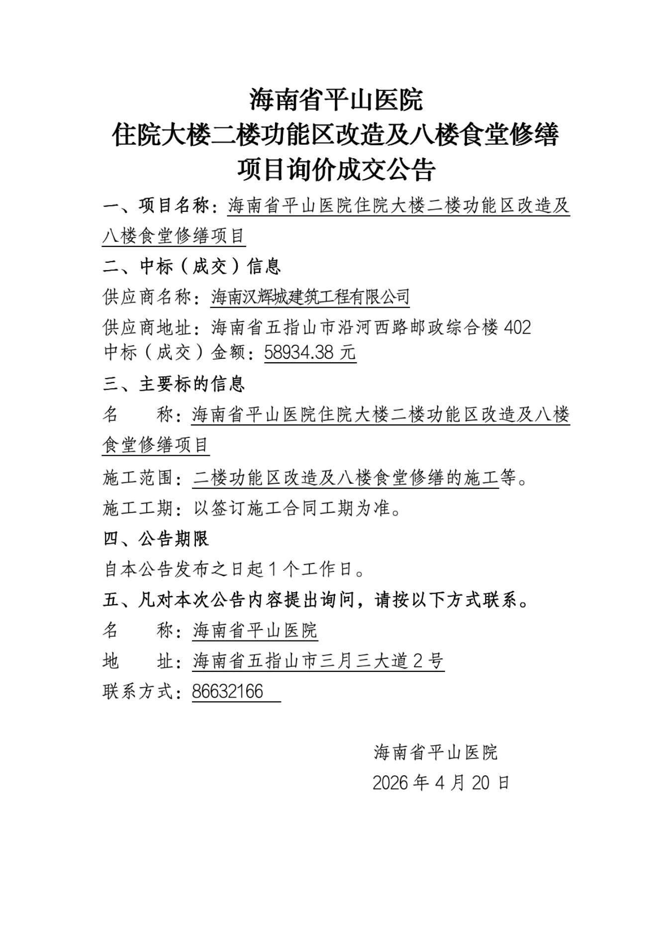 南省平山医院 住院大楼二楼功能区改造及八楼食堂修缮项目询价成交公告