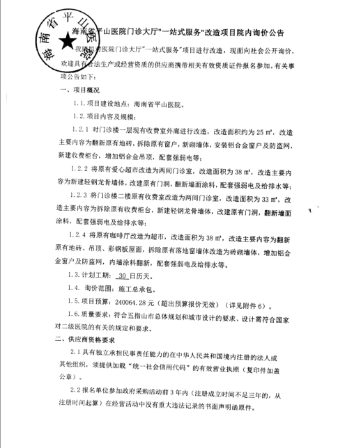 海南省平山医院门诊大厅“一站式服务”改造项目院内询价公告
