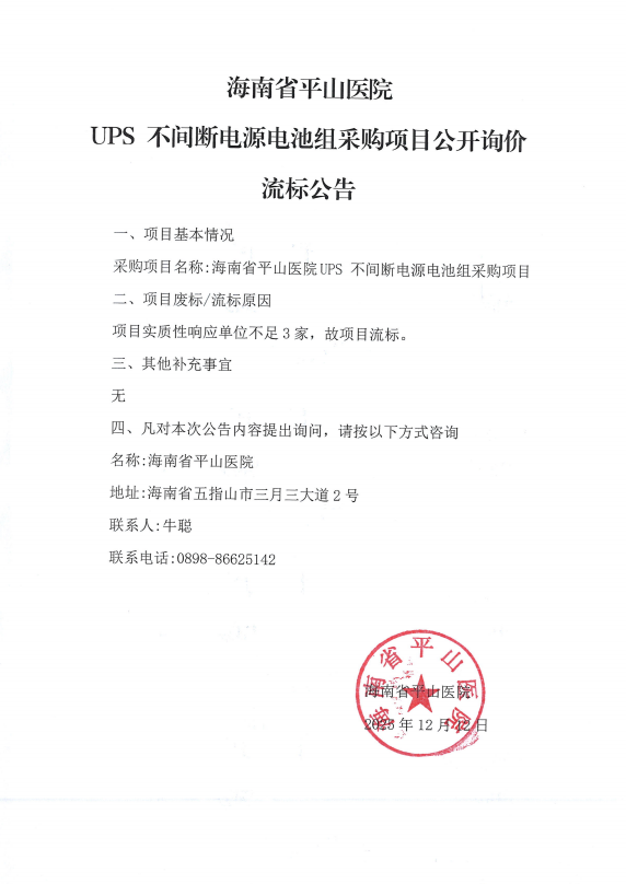 海南省平山医院UPS 不间断电源电池组采购项目公开询价流标公告