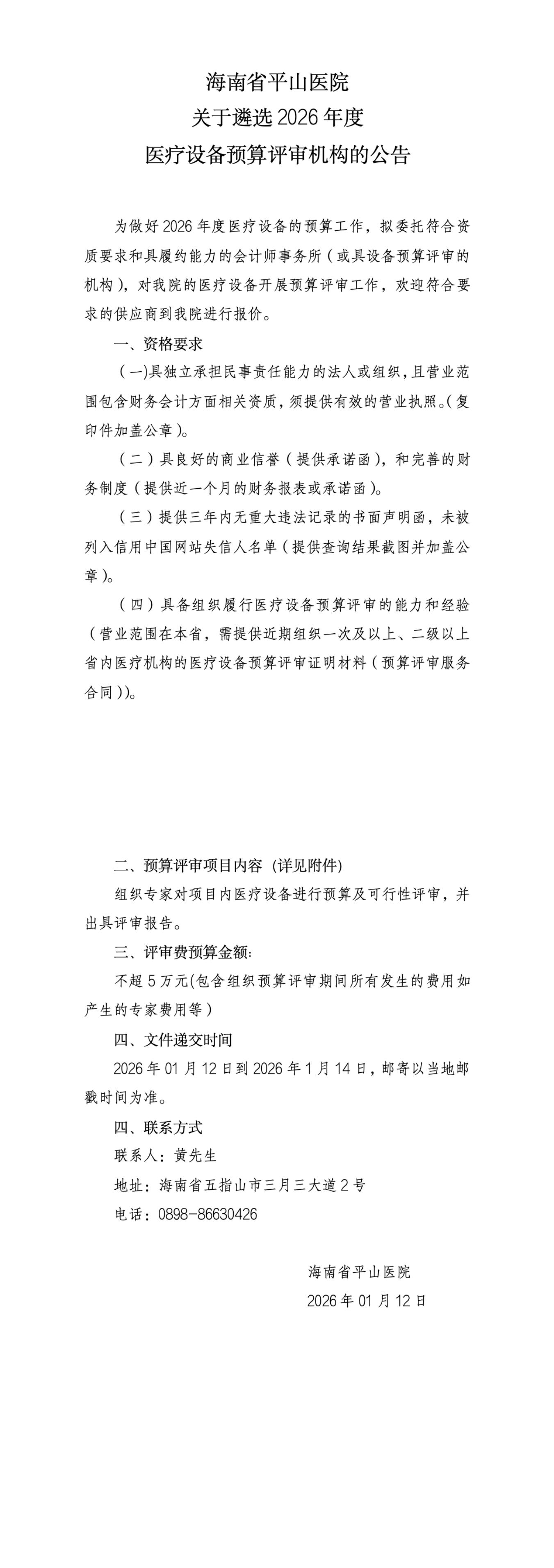 海南省平山医院关于遴选2026年度医疗设备预算评审机构的公告