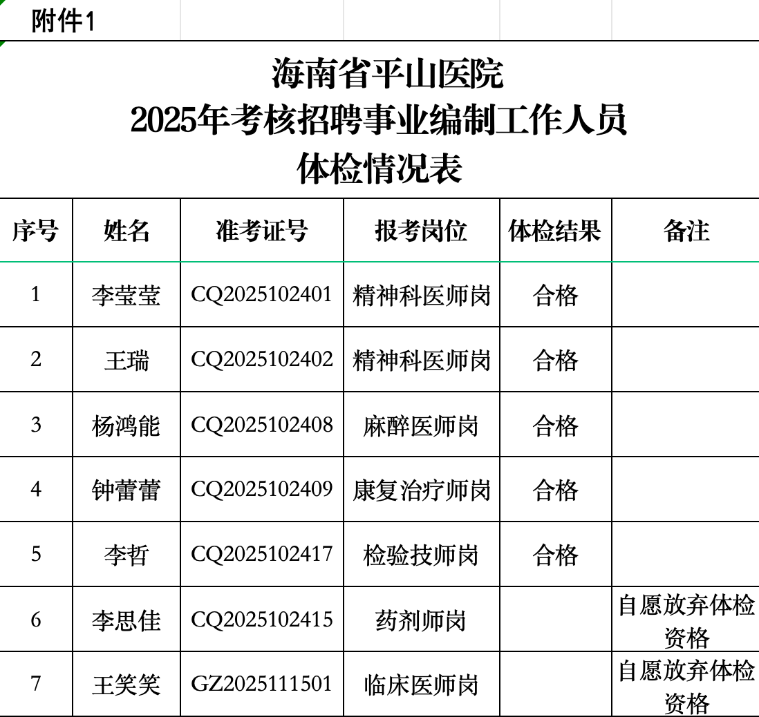 海南省平山医院 2025年考核招聘事业编制工作人员公告 (第7号) 海南省平山医院2025年考核招聘事业编制工作人员(海口站)报名工作已经结束,因海口站招聘临床医师岗位在规定时间内无人报名,经海南省平山医院招聘工作领导小组研究,决定取消海口站临床医师岗位考核招聘,海南省平山医院2025年考核招聘事业编制工作人员公告(第1号)的临床医师岗位由2个职数相应核减为1个职数,现予以公告。 一、...