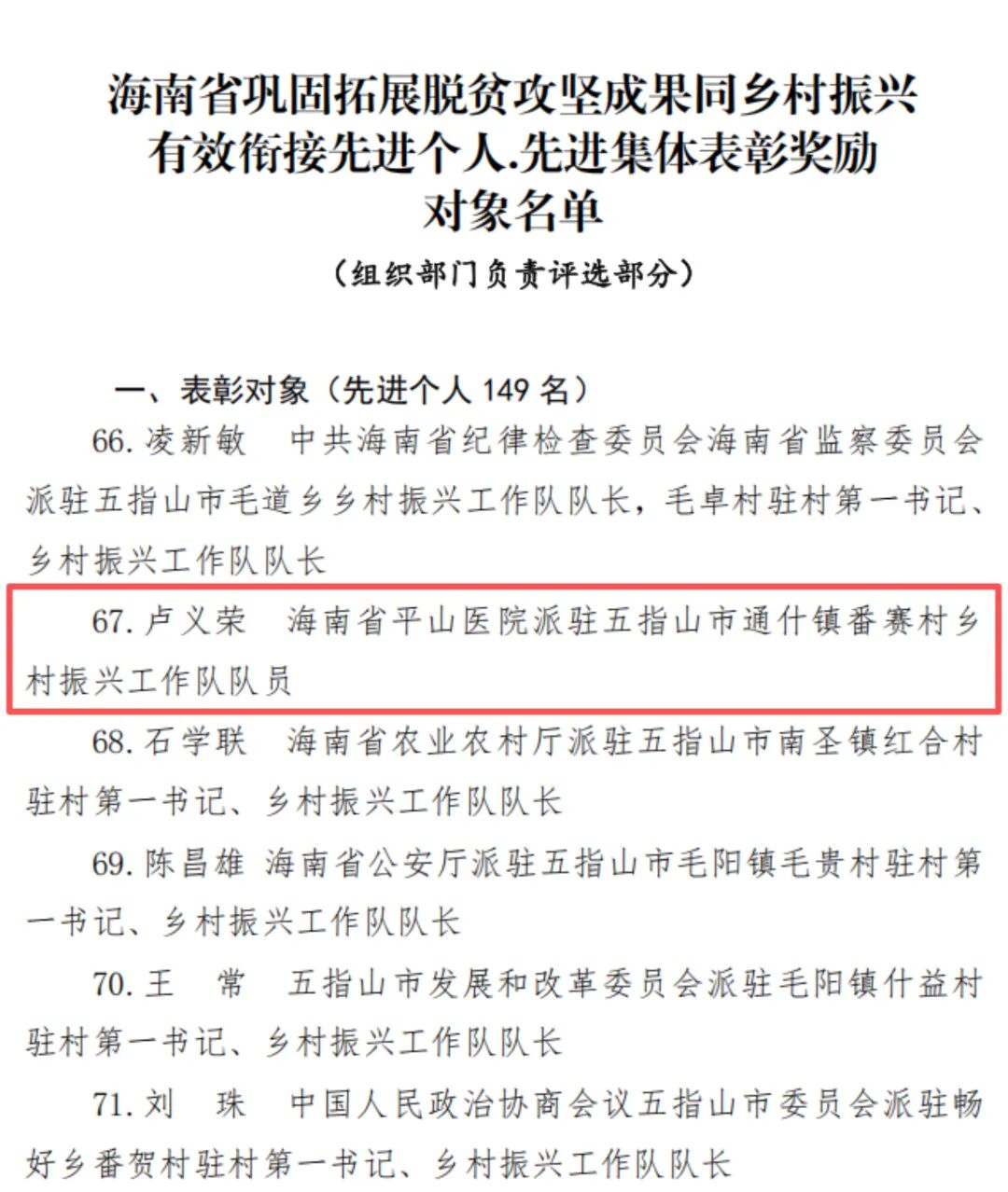 近日,2025年海南省巩固拓展脱贫攻坚成果同乡村振兴有效衔接先进表彰中,海南省平山医院派驻五指山市通什镇番赛村乡村振兴工作队队员卢义荣同志荣获“先进个人”称号。这一荣誉不仅是对卢义荣同志扎根基层、担当作为的肯定,更是对海南省平山医院长期以来积极投身乡村振兴事业、发挥医疗优势助力基层发展的高度认可。 以担当 促振兴 作为省级公立医院...